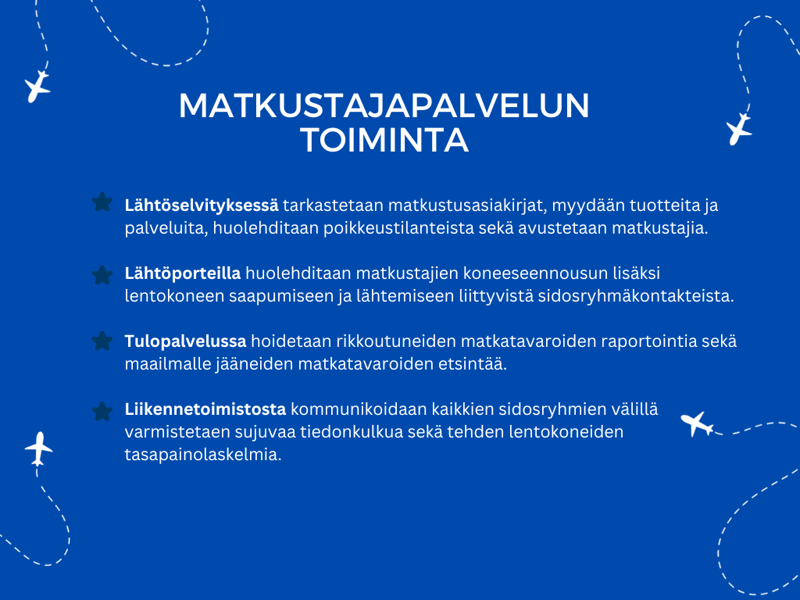 Matkustajapalvelun toimintoihin kuuluu lähtöselvitys- ja porttitoiminnot, tulopalvelu sekä liikennetoimisto.